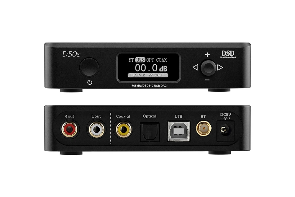 >USB of D50s supports DSD64-DSD512(Native)and PCM16bit/44.4kHz-32 bit/768 kHz. Coaxial and Optical inputs support up to PCM 24 bit/192 kHz and DOP DSD64.