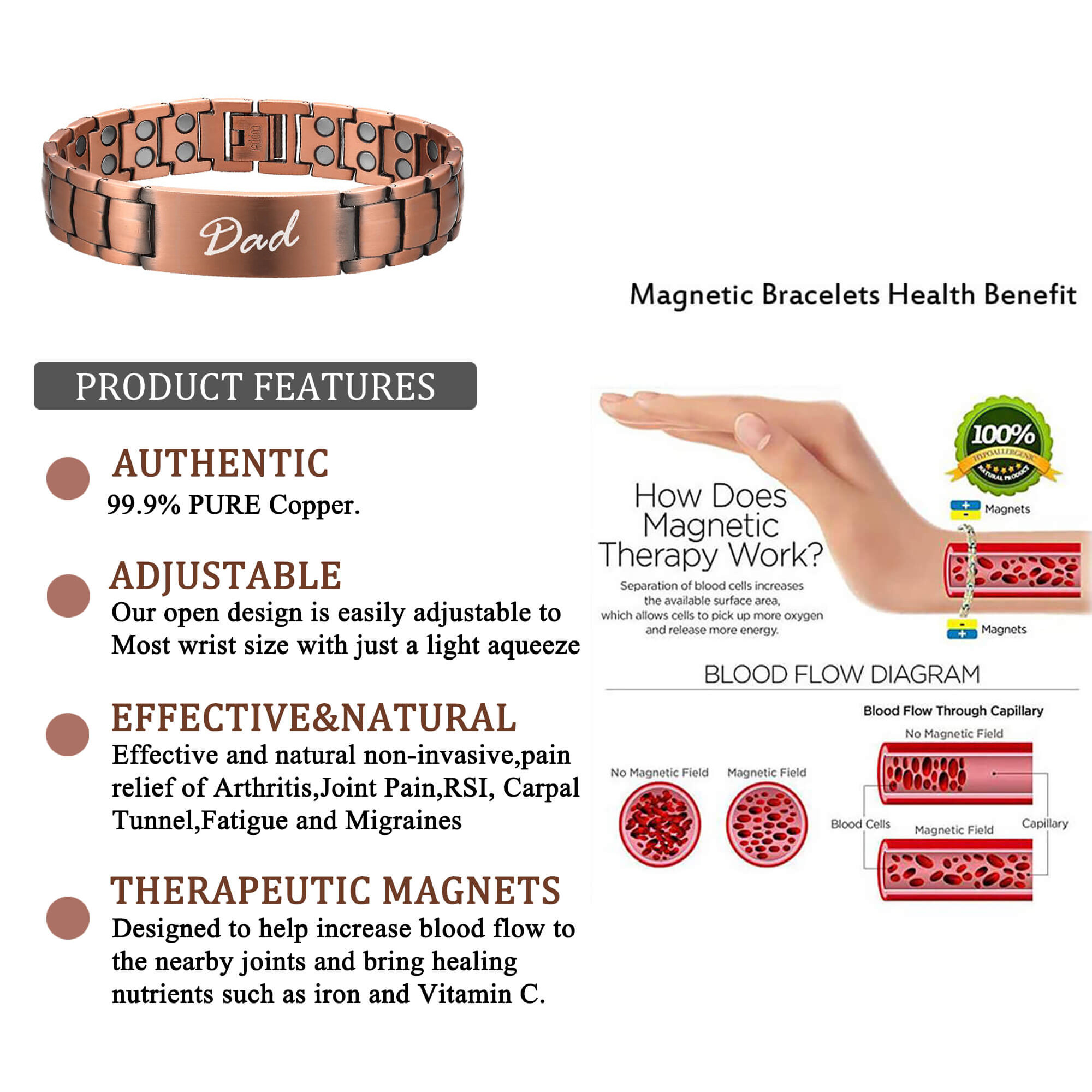 Pure Copper with Double Row Magnets Bracelets for Dad Arthritis Pain Relief