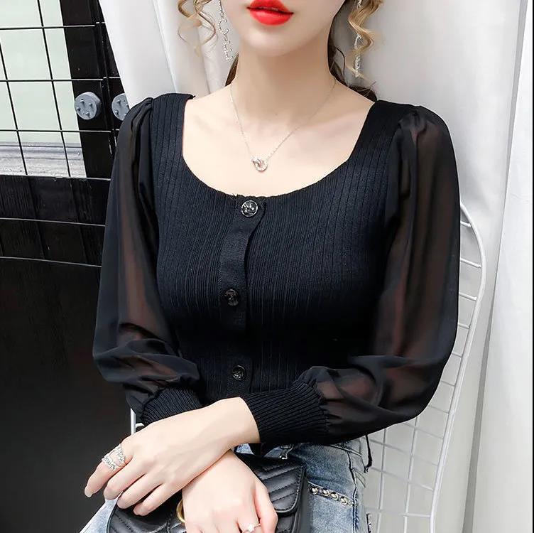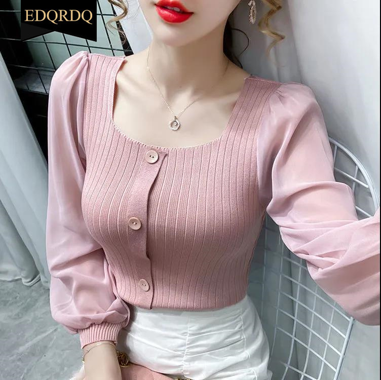 EDQRDQ Women's Puff Long Sleeve Contrast Mesh Square Neck Pullover Blouse Top