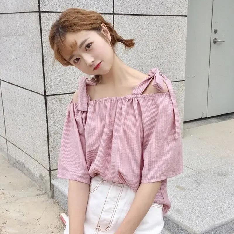 EDQRDQ Womens Summer Off Shoulder Blouse Striped Lace Up Top 3/4 Sleeve Casual Chiffon Tops Shirts