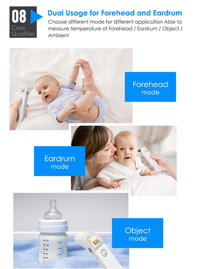 We want to make a thermometer that is capable of accompanying your child from baby to adulthood. That is why our Dual-mode infra-red thermometer is designed to be BOTH an ear thermometer (recommended for age >1) AND a forehead thermometer (recommended for all ages), offering users the freedom to choose between two modes. There is NO need for a plastic probe cover. Using the latest infra-red scanning technology, it has proven to be extremely reliable and accurate during clinical trials.